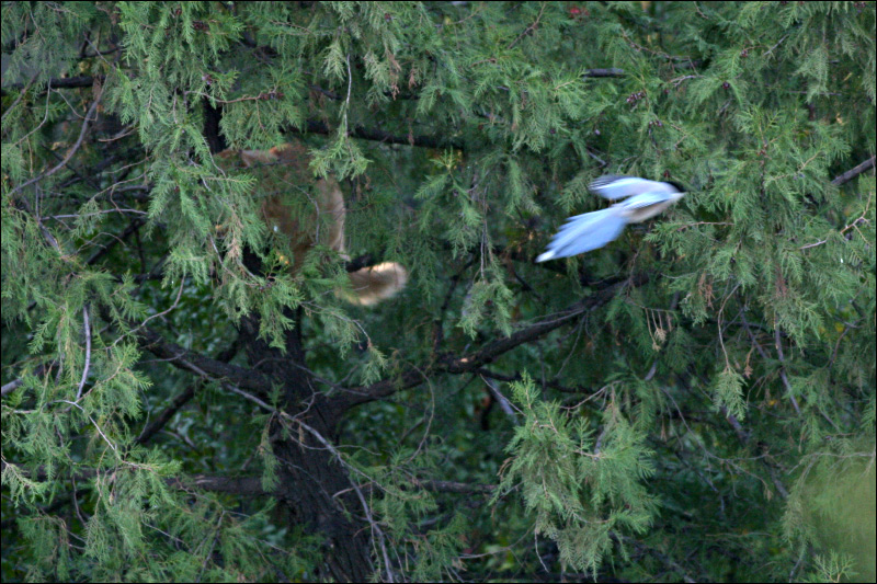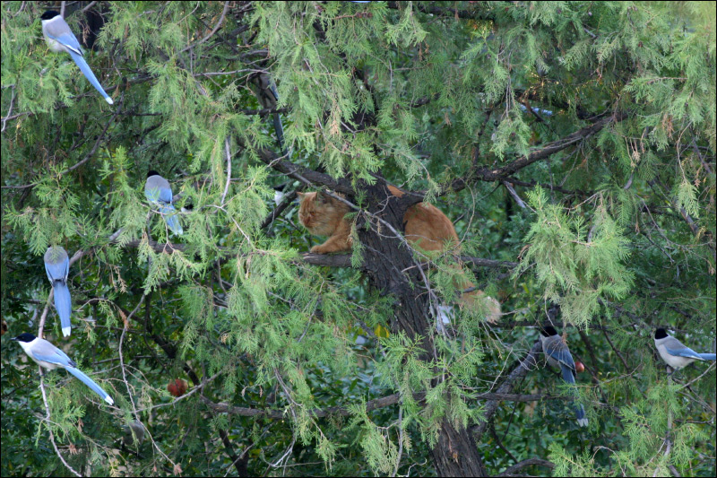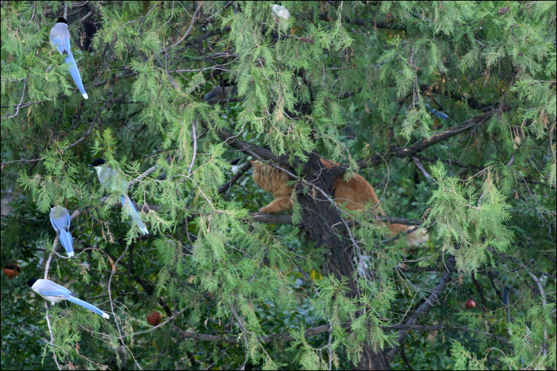 | 我前次拍到猫猫上树与灰喜鹊们“过招儿”是在大约个把月之前。经历那次失败后猫猫一直在运气,今天的行动明显带有复仇性质。 多少英雄梦想,近在咫尺间…… ![]() |