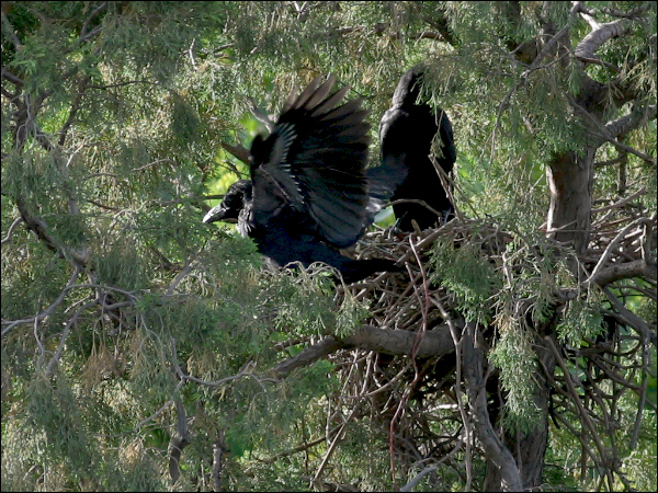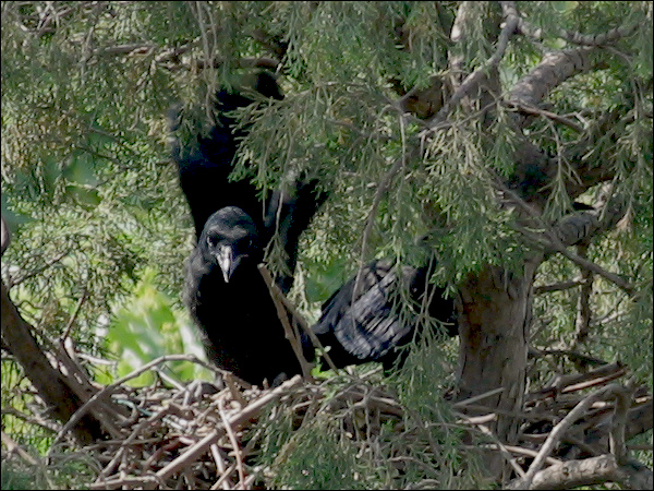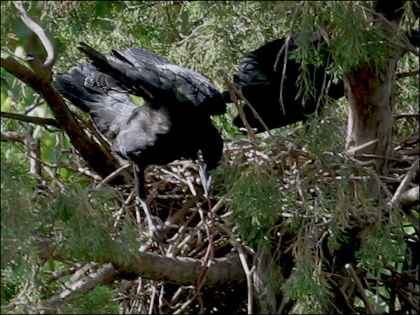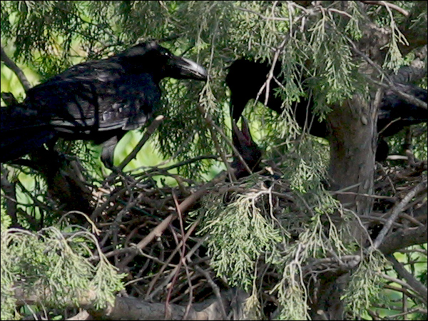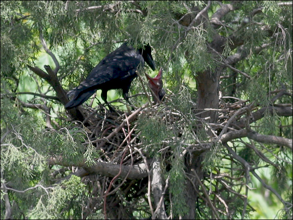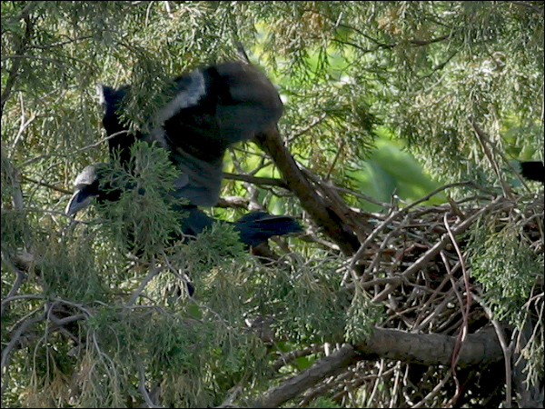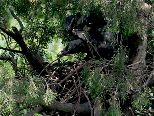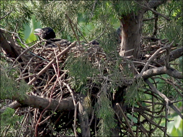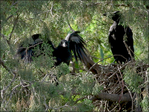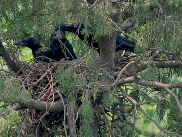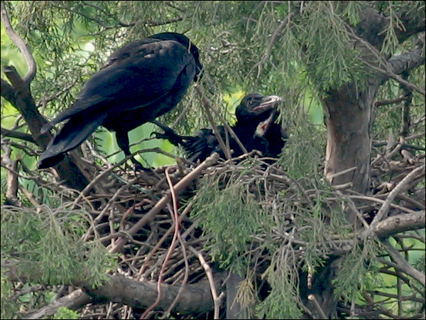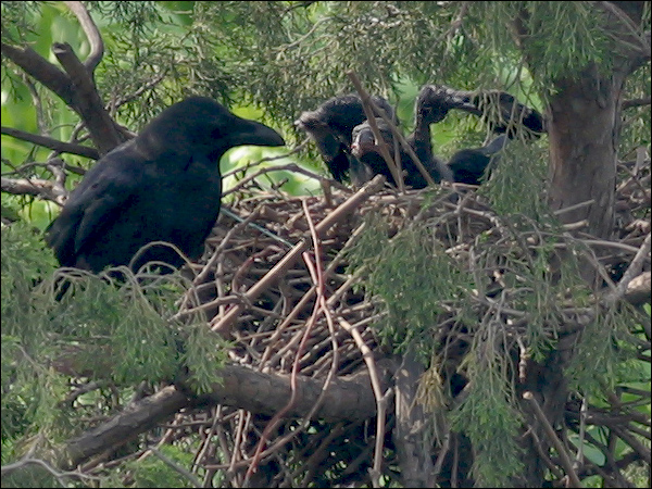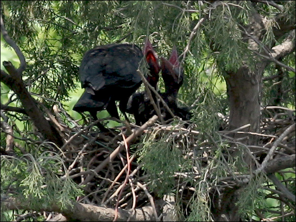 小鸦们越长越大,站在巢里已经很碍事,鸦妈妈清理巢底时必须时时把他们的翅膀或尾巴叼起来。小鸦们倒也非常听话,叼起翅膀就举着,叼起尾巴就蹶着。我们的孩子都没这么乖! |