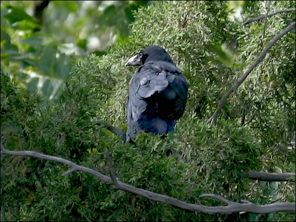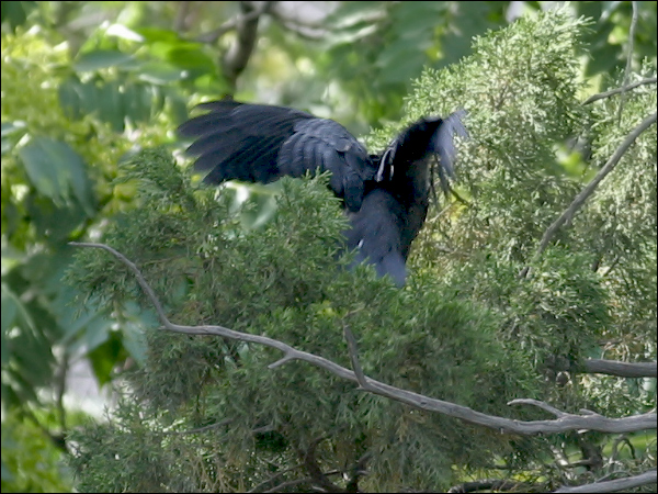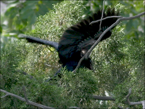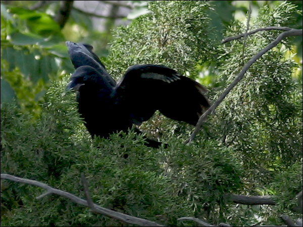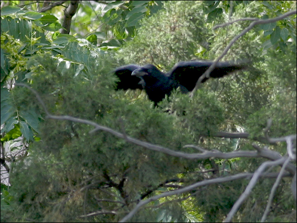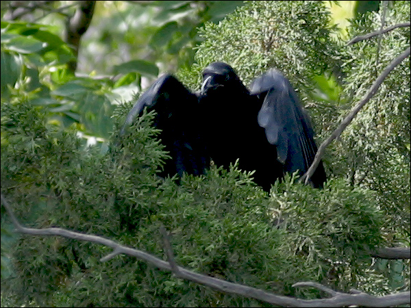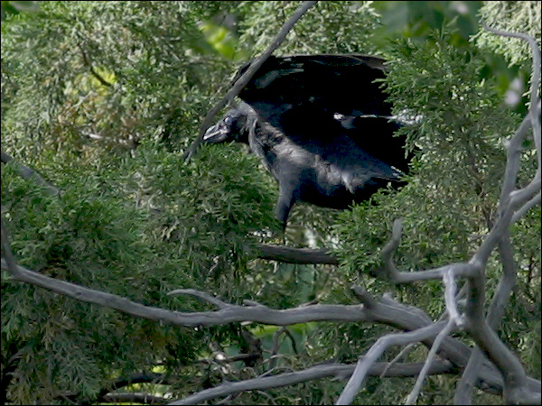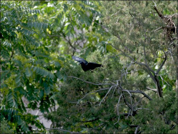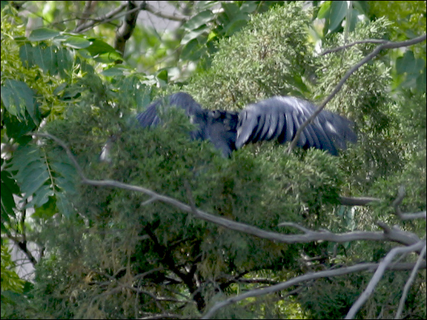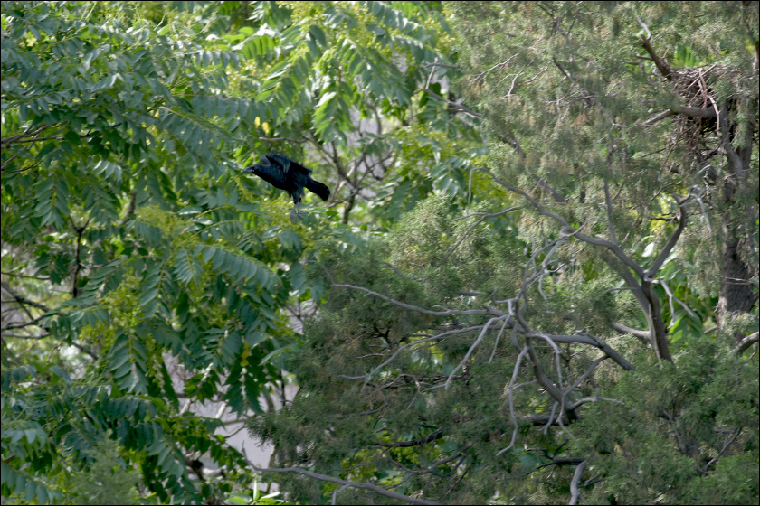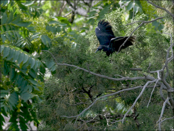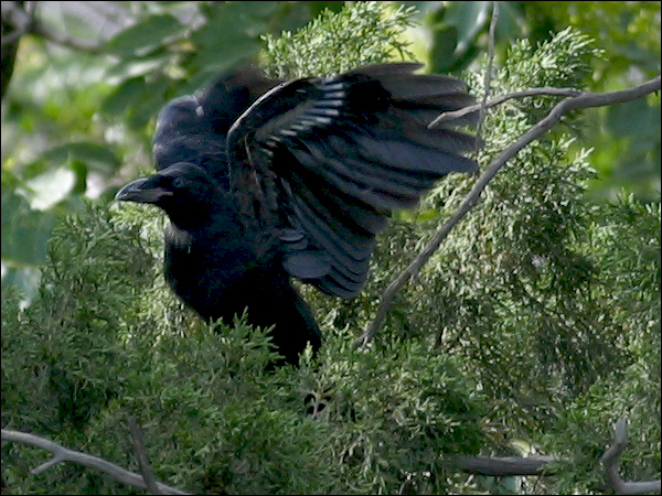 椿树与柏树相距不过七、八米,但是跨越这个距离已经不能靠“走”,只能飞。此前小鸦曾经站在巢边上对着这个方向久久眺望,相信在他心中已有很多计划。这会儿我看着他一步一步走到树枝尽头,然后勇敢地张开翅膀,开始生命中的第一次试飞……
