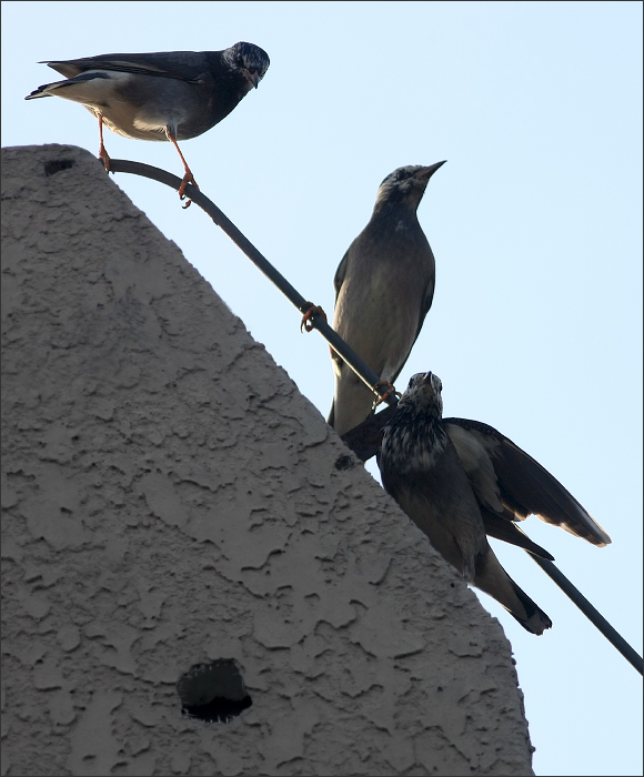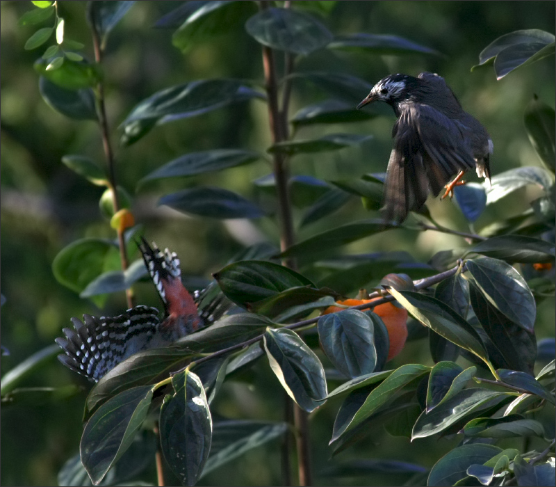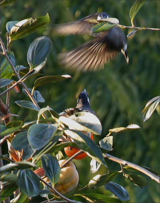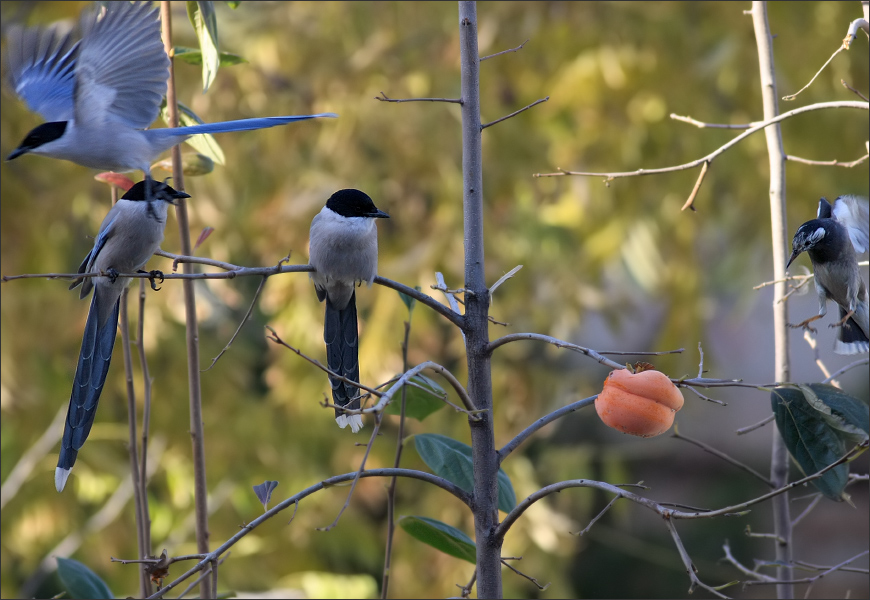 下图是季节中的一个小小插曲——那天几只灰喜鹊正在柿子树上排着队吃饭,一只灰椋鸟突然出现。它呐喊式地大叫一声从天而降,居然把一只毫无准备的灰喜鹊吓蹿了。其它几只灰喜鹊一时愕然。 平时从来都是灰喜鹊们欺负灰椋鸟,灰椋鸟虽然也不肯示弱,但那都是群体抵抗。今天这只单枪匹马的小椋鸟竟异常嚣张,大概是迁徙途中饿急了,眼中只看见柿子,没注意周边局势。待它在枝上落稳,一抬头才看见几个比它个头大得多的家伙正怒目而视!它自己也吓呆了,随后再次大叫一声,扭头逃蹿。这个柿子它还是没吃着。 |