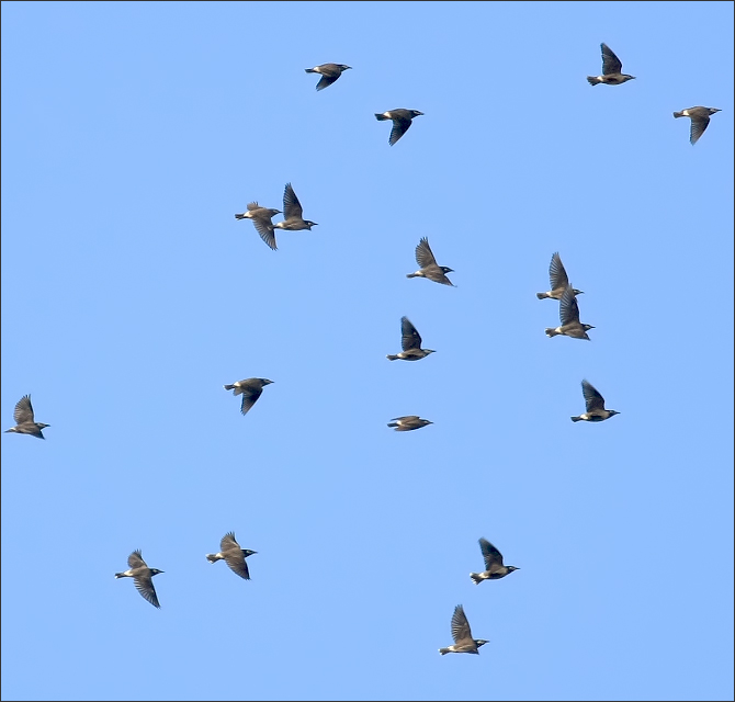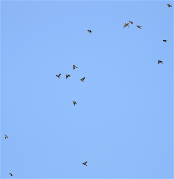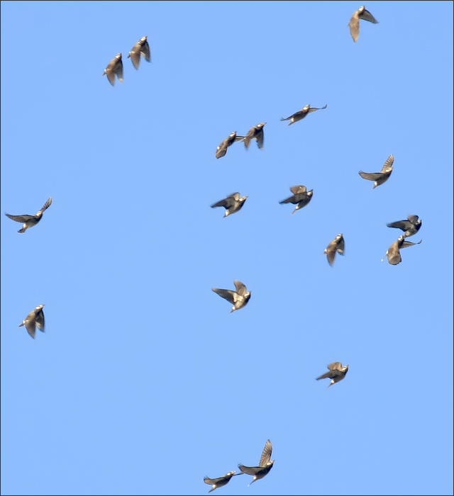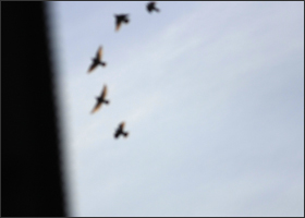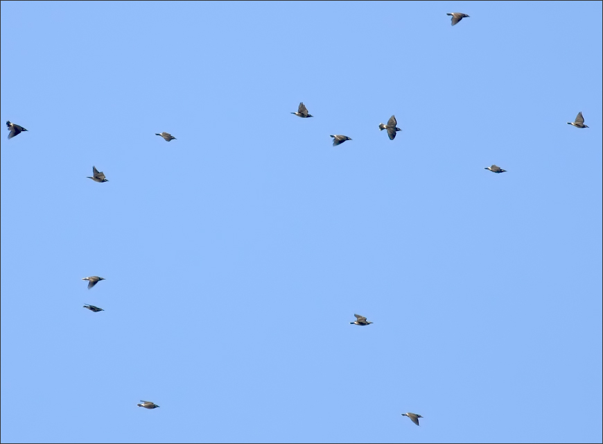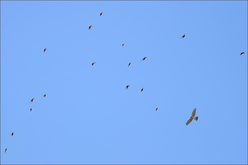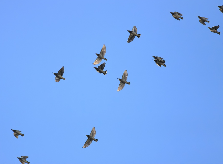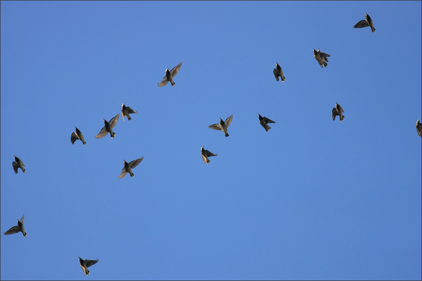 但是16秒钟之后,整个灰椋鸟群全体起飞了!先是报警——我至今还记得那个奇特的声音——那不是灰椋鸟平日里大喊大叫的吵闹声,而是非常紧迫、又非常轻微的连续三声:“嘀嘀嘀!”随即就是“呼啦”一片起飞…… |