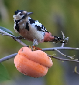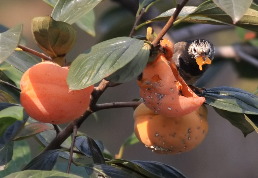 | 秋天来了,我家窗外的柿子树上又结了很多柿子。迁徙过路的小鸟们每天在这里抢柿子吃,以灰椋鸟为主,但也不只是灰椋鸟,还有柳莺、赤颈鸫等等,还有本地的灰喜鹊。 |