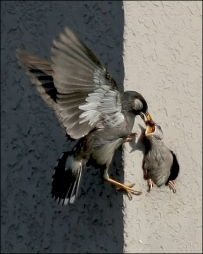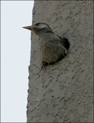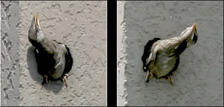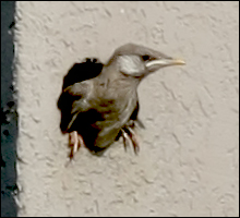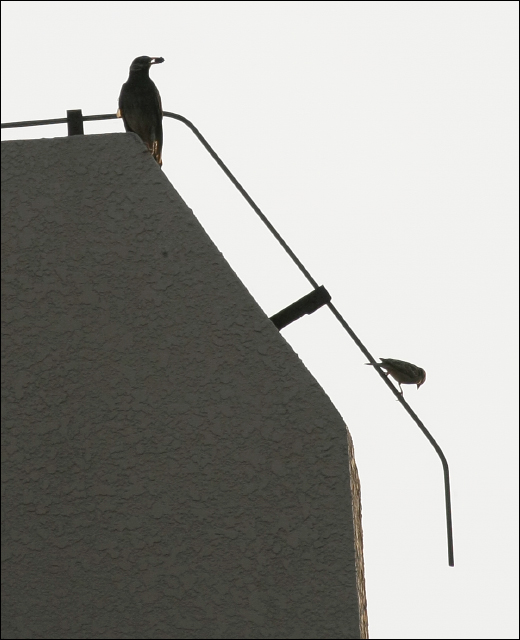 后来准备回家的时候,走到楼门口,我又回头看了一眼,正看见灰椋鸟妈妈叼着食物站在远处的楼顶上。这栋楼就在小椋那栋楼的正南,两楼相隔二、三十米,椋妈妈站在这里,能看见那一边儿子伸出洞口的小脑袋。但她一直没有过去喂他,也不飞走,就这样长久地立着,活象一尊雕像。