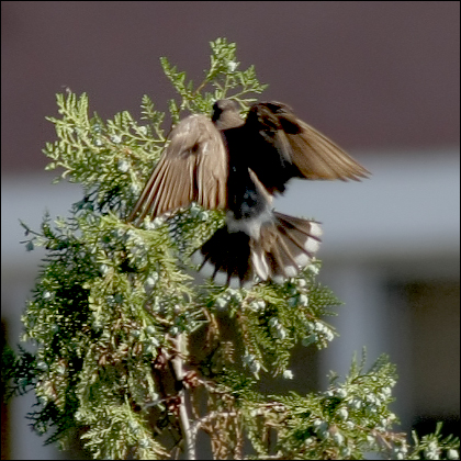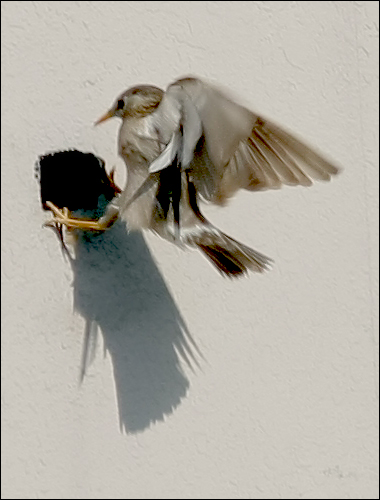 在稍后的某个时刻,小胖子突然从老柏树上起飞,去挑战墙上另一个小洞洞,那是另一户小麻雀的家。我作证,她没偷,可能也就是“踩个点儿”。呵呵,飞还飞不稳呢,就开始惦记人家的家,看来也是巾帼英雄啊!