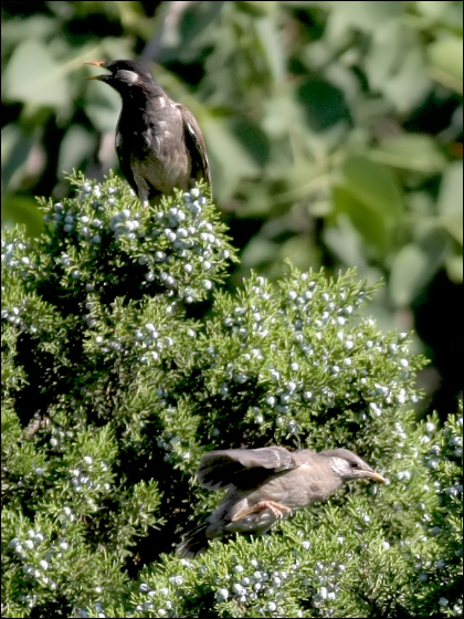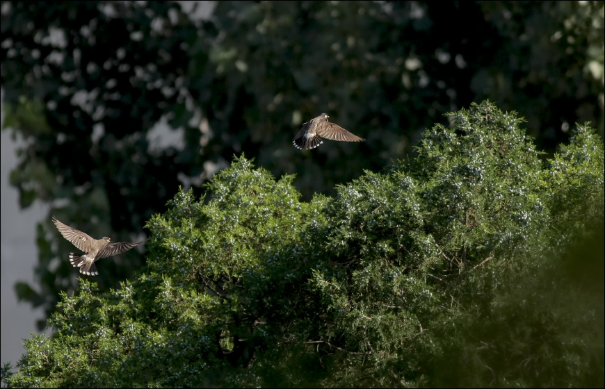 事态平息之后,椋爸爸椋妈妈回到老柏树上,一边继续警惕着喜鹊们的动向,一边看护着小胖子练习飞行,同时还在焦心地等待小儿子。别看小胖子笨笨的,这会儿也已经飞得挺不错,可以在附近几棵树上跳来跳去。
