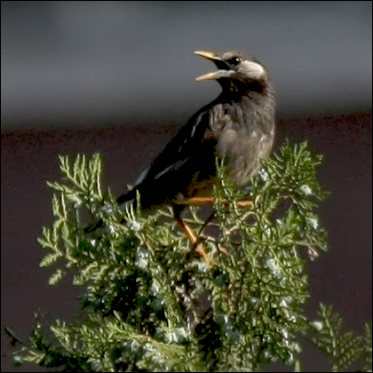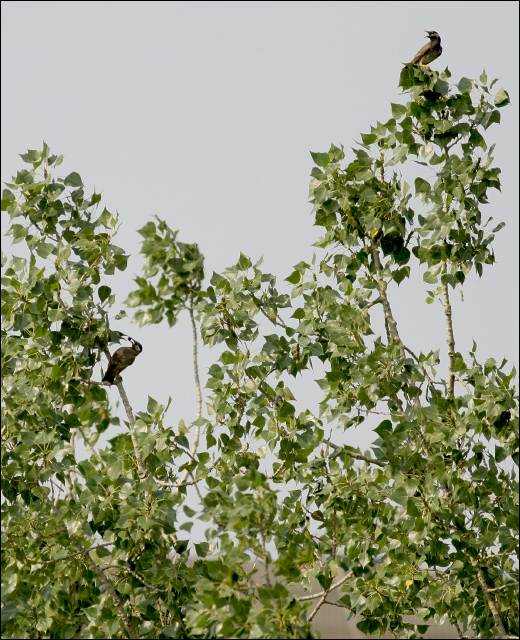 我们院儿常驻的灰椋鸟并不多,但是可能因为树种比较多,食物丰富,所以有更多的椋鸟白天来这里觅食。今天打架的时候,直接参战的男椋鸟就有一群,至少七、八只。它们在战斗中很讲究队形,有时会呈一字型横向展开,呐喊着向喜鹊们发起进攻,就象是一道“散兵线”。黑灰喜鹊都是乌合之众,打架时一哄而上,从来就没见它们象这么讲究过。也许因为喜鹊是“留鸟”,它们没有世世代代在长途迁徒中形成的“团队基因”吧。可惜我拿着长焦镜头,不能拍下整个场面。总之今天战争的结果是:喜鹊们终于未能把灰椋鸟群赶出领地,大家只好继续在一起混饭吃。 |