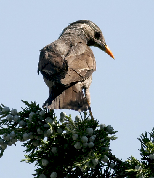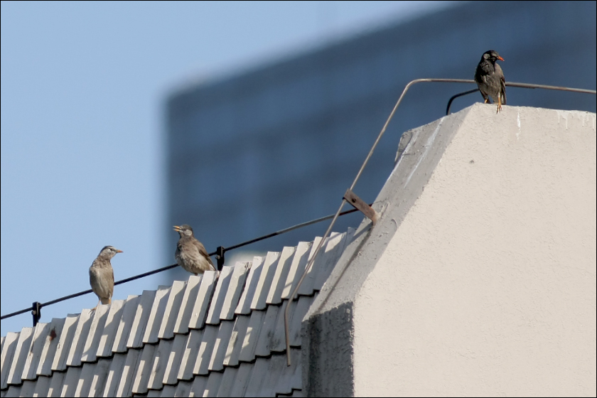 清晨,院子里的小鸟们都在忙着觅食,叽叽喳喳非常活跃。7:40前后,三只灰椋鸟飞到小洞洞的楼顶上,象是一家三口,爸爸妈妈带着一个孩子。我猜想:这个也许是小胖子?但是如果小瘦猴儿还在洞洞里,他们一家能有这么轻松快乐么?设想这个就是小瘦猴儿也不太可能,就算他真的飞出来了,也不会一下子就飞到这么高的楼顶上啊。小胖子离巢之后在大榕树一带作初级飞行训练,耗时得有一、两天呢,第二天她去挑战小麻雀的家,还没有这么高,我都已经很惊讶了。想来想去,这一家可能是过路的其它不相干的灰椋鸟。但是这个椋鸟爸爸总是低头去看楼下的小洞洞,又让我感觉有点儿怪怪。