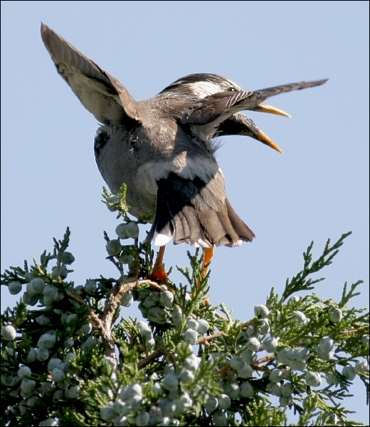 正要收起相机,椋爸爸忽然从老柏树上起飞,他绕着小洞洞的楼顶转了很大一个圈子再落回来,飞得真是漂亮!