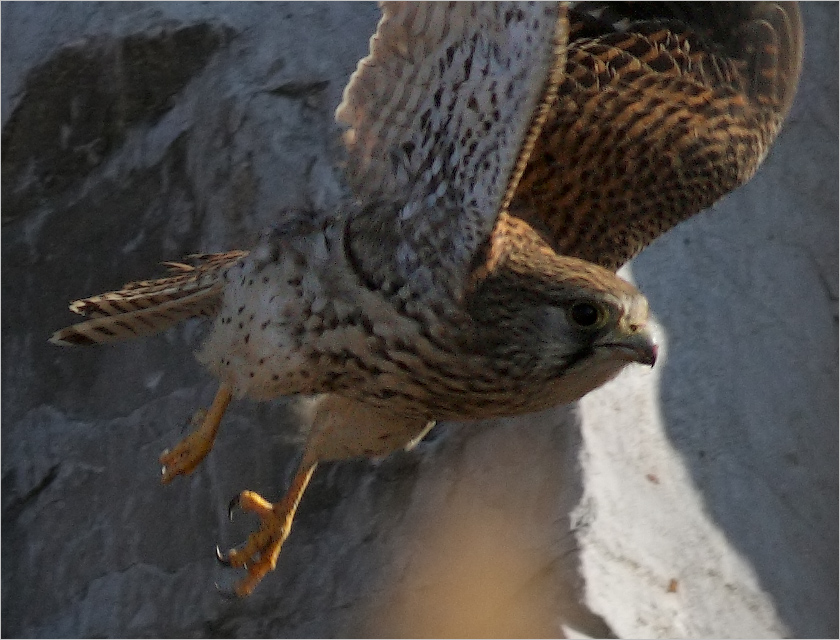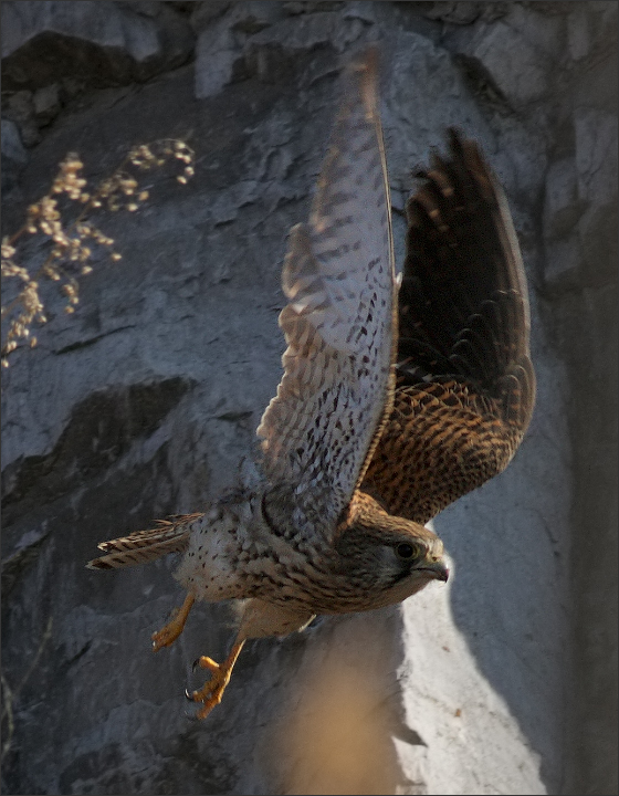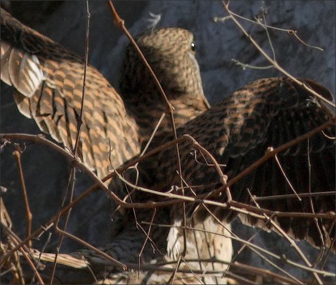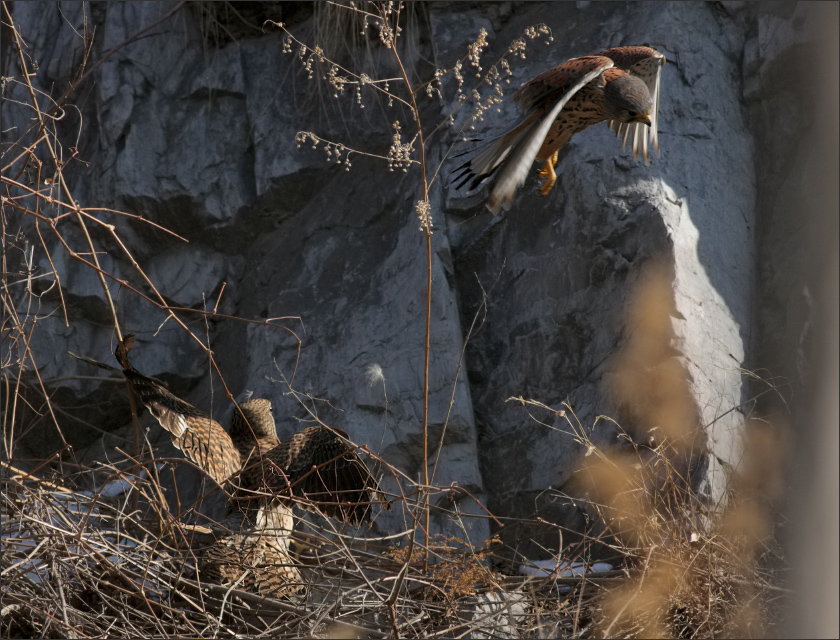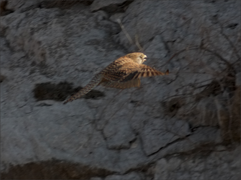 后来MM飞到下面河滩上去了,我扭头刚要走开,一个红隼小GG忽然紧贴着岩壁快速飞来。他一路溜着边儿走,随后落在山坡一块岩石上,面对山下小心张望,显得十分谨慎。![]() |