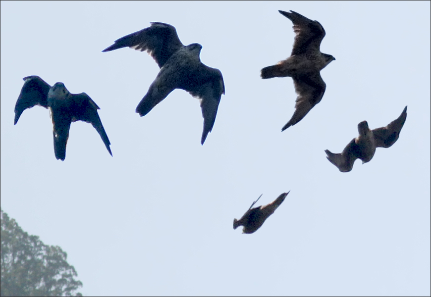 我从来不用相机的“连拍”功能,我觉得那没有抓拍的乐趣。我就喜欢这样一张一张地把眼前的场景定格下来。差不多两秒钟一张,下图是五张照片合成。很壮实的一只猎隼,起飞,扫视周围天空,转身扑向山崖……