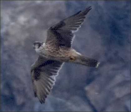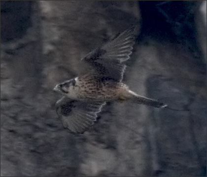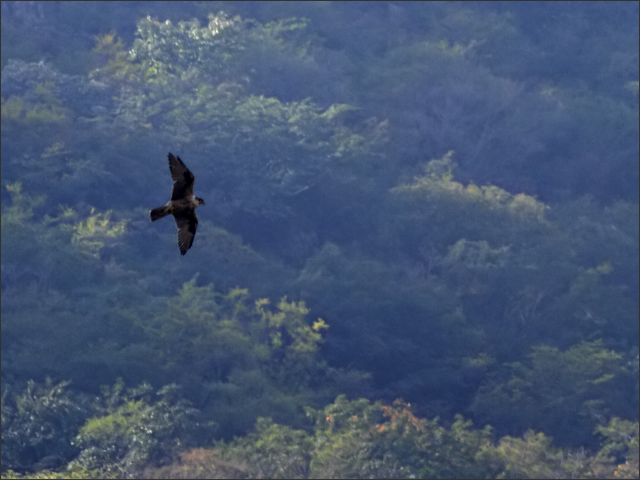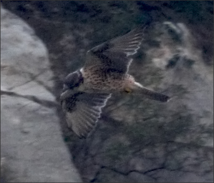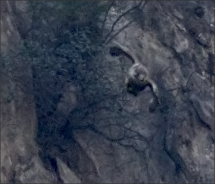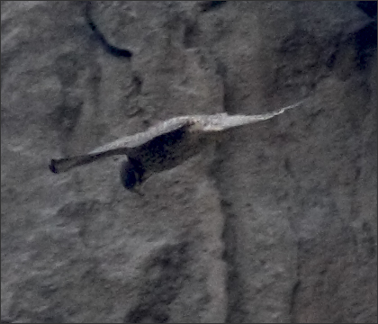 左图山岩上那处树丛就是猎隼栖身之地。我拍这张照片时,山崖上正传来小鸟们一片报警声。有一只不知什么鸟叫得最响,那是一种很哀、很绝望、几乎不管不顾的响亮而拖长的大喊大叫,与人类在绝境中的哭号声相当近似。相信那可能是一只未经世事的幼鸟,而它的家长们肯定是坚决制止了它,后来那个声音中止了,再也没有听到。