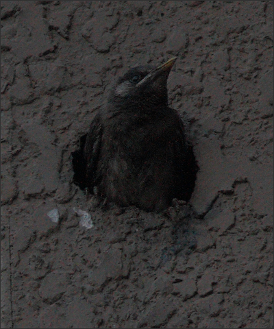 来不及上楼,直接跑到楼后去看高墙上的小洞洞——剩下的两只小椋鸟此时只见一只,“一撮毛儿”不见了。