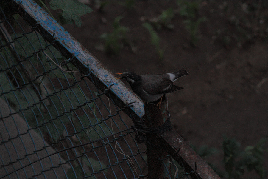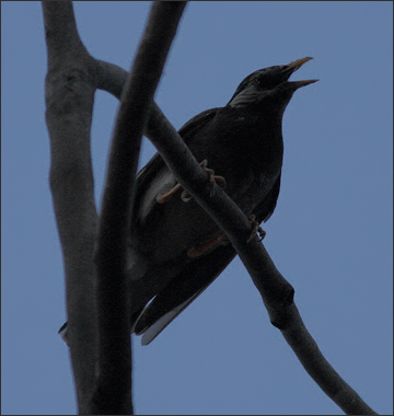 后来黑喜鹊暂时退走,局面稍稍平息,椋妈妈立即落到楼下门球场的护栏上,朝着下面灌丛中急迫呼叫。
