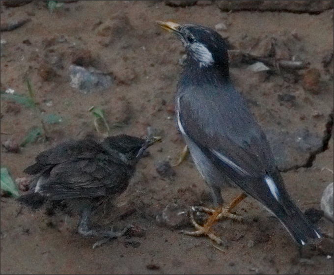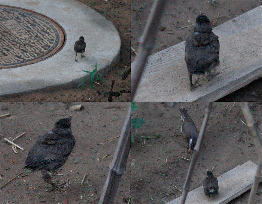我还是第一次看到灰椋鸟雏鸟与成鸟的体量之比。过去它们在洞中,单看脑袋,好象比父母也小不了多少,却原来,成倍之差的是身长、翅长、尾长……只有它们的“大脚丫子”是早早就长得跟父母差不太多了。 |