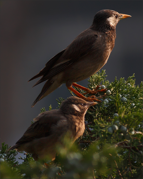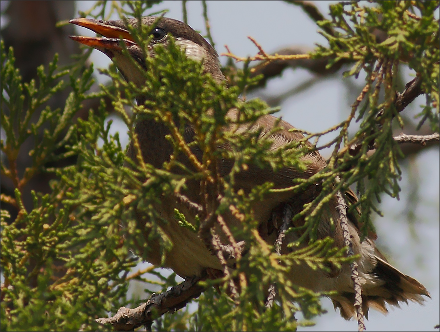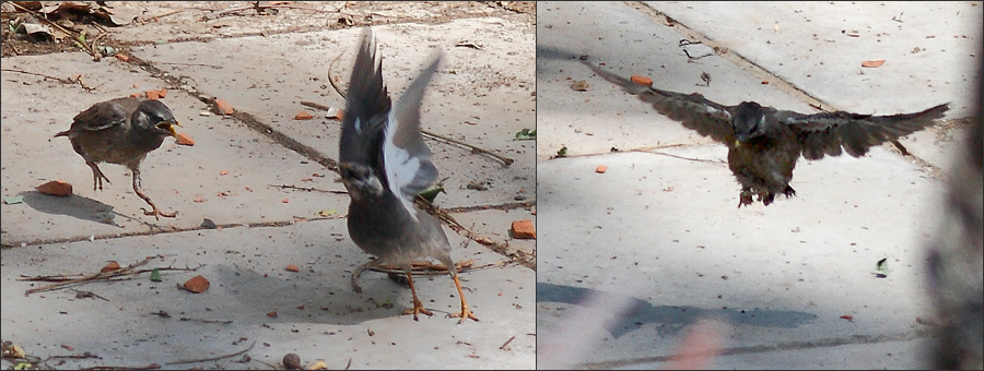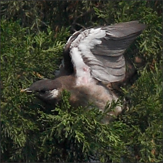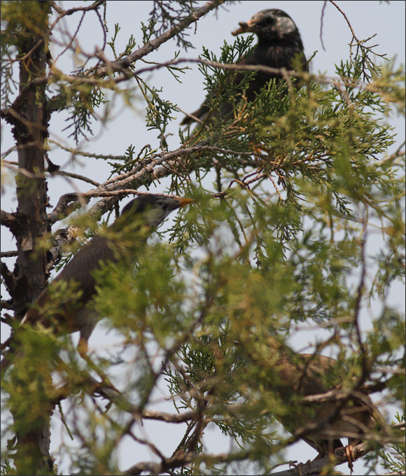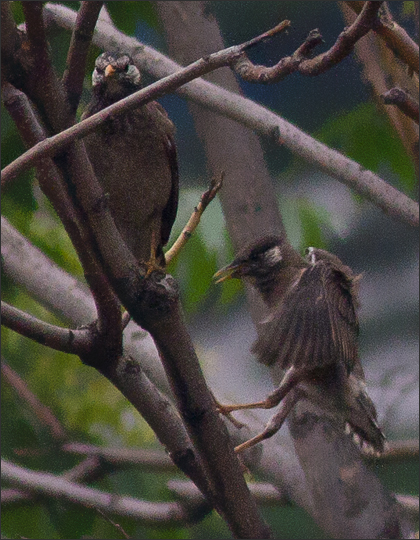 右图是继续让我迷惑的一幕:椋妈妈呼叫了一早上,这时终于有一只男椋鸟飞到老柏树上来。从椋妈妈欢悦的叫声和表情上看,这应该就是椋爸爸,但他嘴里分明叼着食物,小椋蹦过去乞食时,他却没有喂给小椋。他只是稍停了一下,低头看看这娘儿俩,然后就叼着食物径直飞到楼后东小院那边去了。当时椋妈妈扔下小椋大叫着紧追过去,而小椋一路叫唤着又去追妈妈,一家人全都飞到楼后去了。