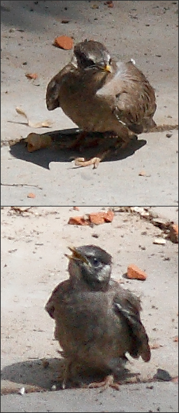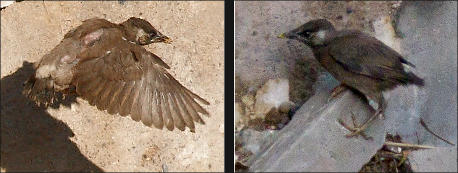 我刚才听到的吵闹声是父母继续频繁飞来喂食。每当父母离去时,地上的小椋总是拼命追着爸爸妈妈,想尾随它们一起飞起来。但它似乎还是不行。