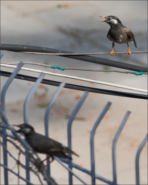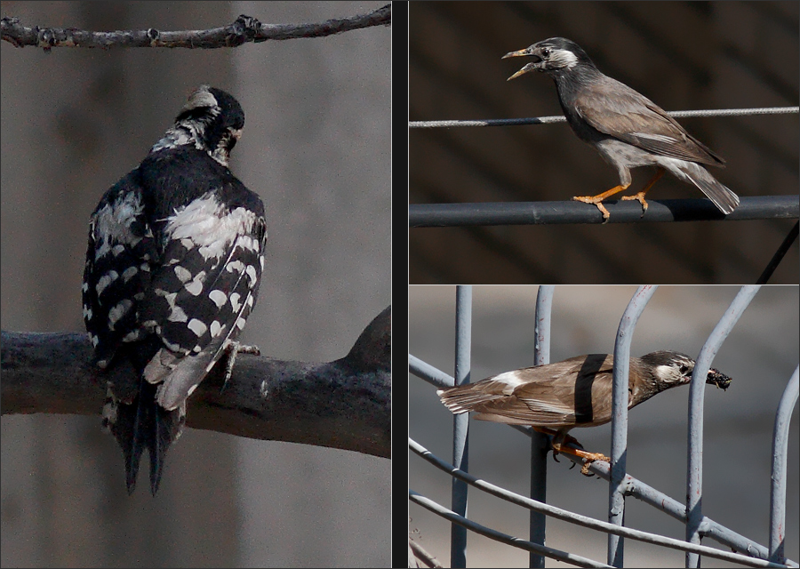 其间有非常好玩儿的一幕我没拍到:椋爸妈迎面阻挡黑喜鹊,不许它们靠近这一带;一只灰喜鹊飞来与它们并肩站在一起,表示“声援”。后来椋爸妈还没出手,灰喜鹊倒抢先冲出去跟黑喜鹊打上了!那一刻我几乎有一种冲动想写一本书,就叫《谁是最可爱的鸟》……