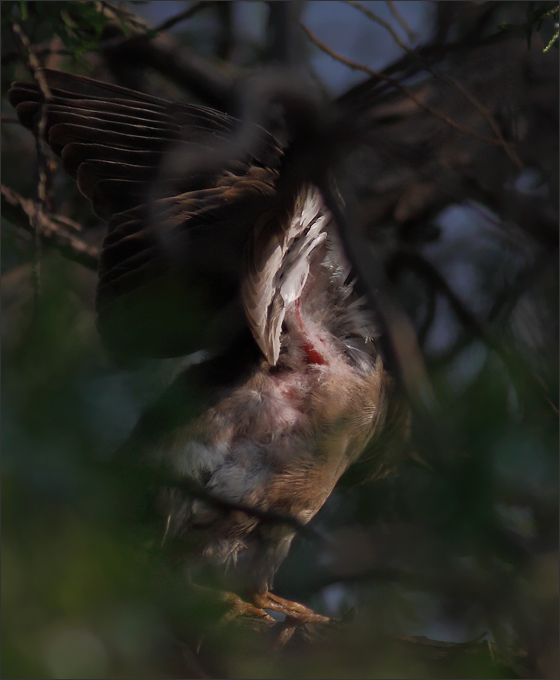 趁妈妈外出觅食的时候,小椋在树上拍打着翅膀继续进行飞行训练。它让我看到了翅膀下面很深的伤口。