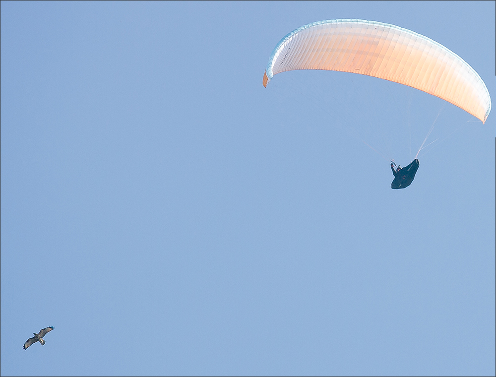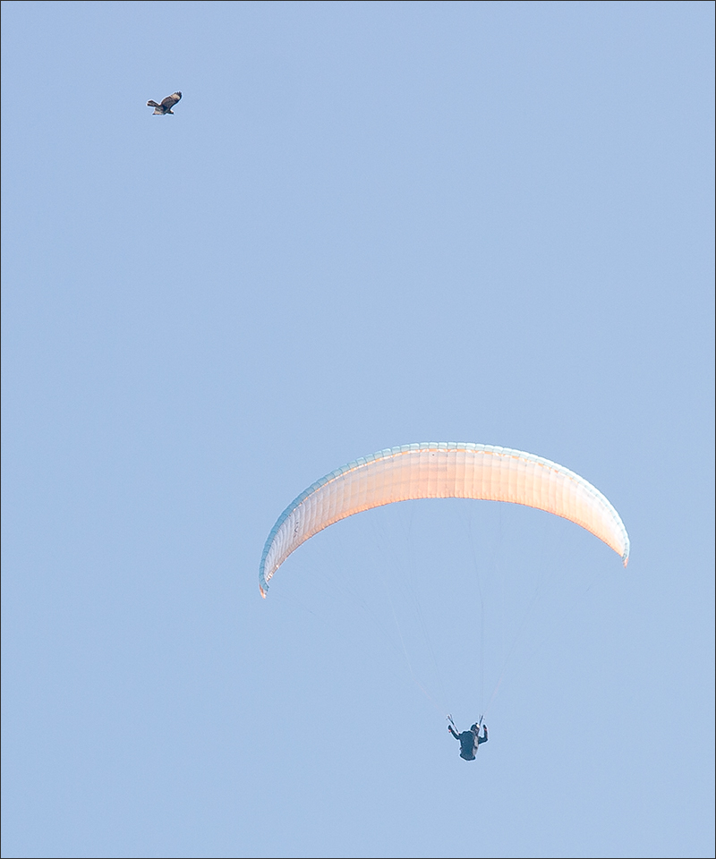 | 跟随乌雕一起赶路的还有普通鵟,它们数量最大。这时有4、5只鵟好奇地围住了滑翔伞, 它们随时可能攻击天空的“不明入侵者”。 ![]() ![]() ![]() ![]() |